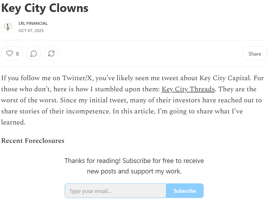 In August of 2025, a 100-unit new construction property called Joshua Landing located in Joshua, Texas was foreclosed on. Moreover, in late 2025, investors filed a lawsuit alleging that KeyCity Capital and its managing partner, Tie Lasater, fraudulently misrepresented the project’s financial health and their own investment record. One investor reported a loss of over $1 million in the Joshua Landing project specifically.
